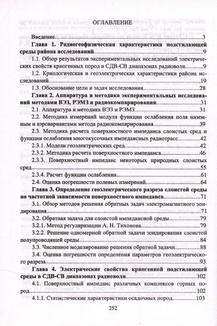 Монография посвящена детальному изучению электрических свойств (поверхностному импедансу, электропроводности и диэлектрической проницаемости) криолитозоны Центральной Якутии, Алданского нагорья и тундры вблизи побережья Северного Ледовитого океана в низкочастотной области радиодиапазона. Основное внимание уделено определению их электрических характеристик и построению геоэлектрических моделей различных типов криолитозоны. Предметом радиоимпедансных исследований является электрическое состояние верхних горизонтов криосферы. Объекты исследования: 1) слоистая криогенная среда - ее состав и особенности соотношения электрических и геометрических свойств слоев; факторы, определяющие тип и изменчивость ее геоэлектрических разрезов; 2) электромагнитное поле как индикатор состояния среды; 3) физические процессы взаимодействия среды с электромагнитным полем. Предназначена для специалистов в области радиофизики и геофизики, а также для студентов и аспирантов физических и геофизических специальностей