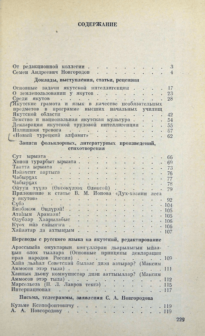 Данное издание предпринимается к 100-летию со дня рождения первого якутского ученого-лингвиста, создателя якутской массовой письменности С. А. Новгородова. Содержит доклады, выступления, статьи, рецензии автора, записи фольклорных и литературных произведений, письма и другие материалы. Рассчитана книга на широкий круг читателей