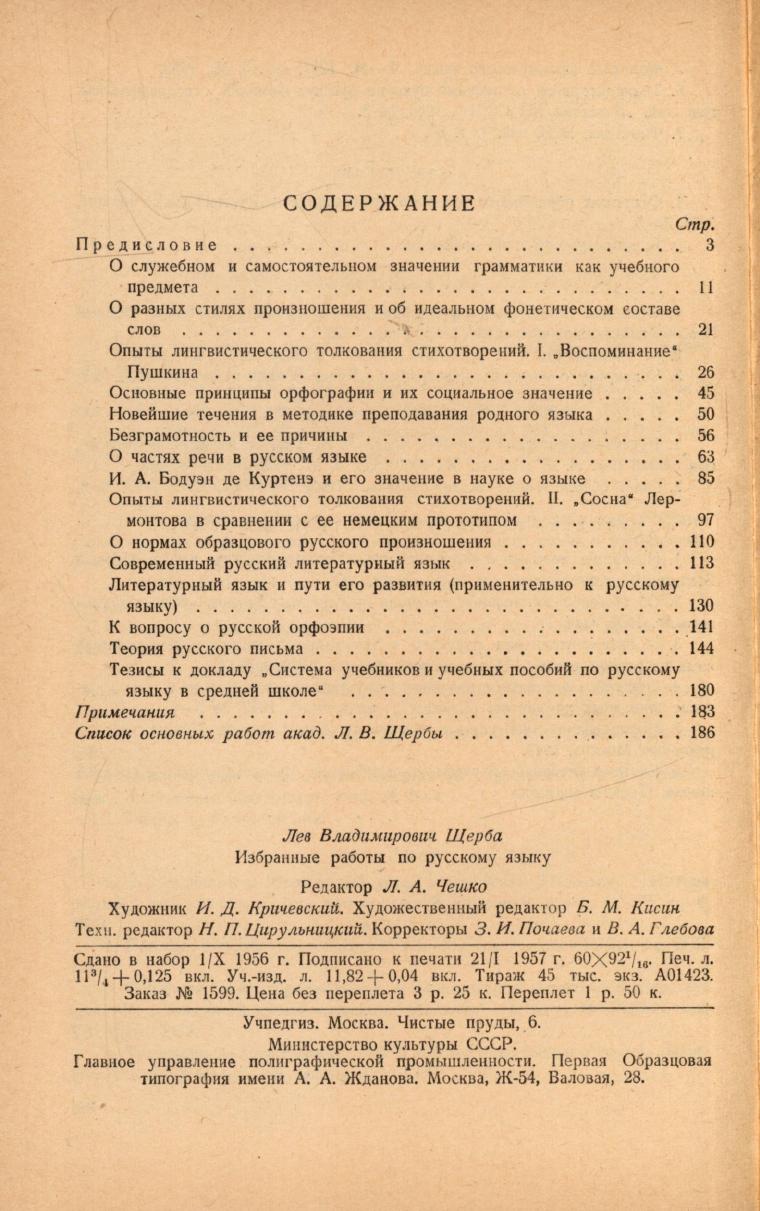 Избранные работы по русскому языку / академик Л. В. Щерба ; [подбор текстов, редактирование и составление примечаний М. И. Матусевич] ; Академия наук СССР, Отделение литературы и языка. - Москва : Учпедгиз, 1957. - 186, [2] с.