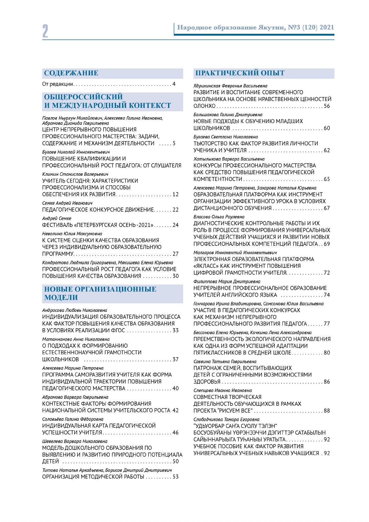 Народное образование Якутии : сетевое издание / Учредители: Министерство образования и науки Республики Саха (Якутия), АОУ РС(Я) ДПО "Институт развития образования и повышения квалификации имени С. Н. Донского-II". - Якутск, 2021- . ISSN 0869-429X. 2021, N 3 (120). - 2021. - 1 файл (202 с.
