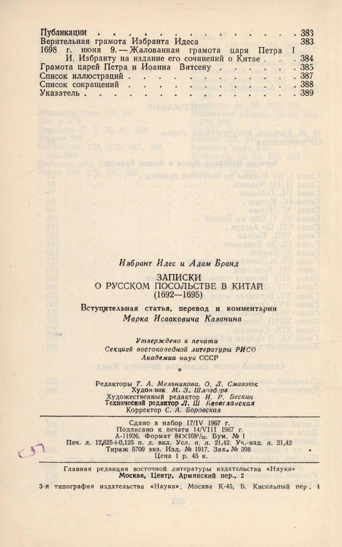 Записки о русском посольстве в Китай (1692-1695) / Избрант Идес и Адам Бранд ; вступительная статья [c. 5-47], перевод и комментарии М. И. Казанина ; ответственные редакторы: Б. Б. Кафенгауз, В. С. Мясников ; Академия наук СССР, Восточная комиссия Географического общества Союза ССР. - Москва : Наука, 1967. - 403, [1] с., 1 л. карт.