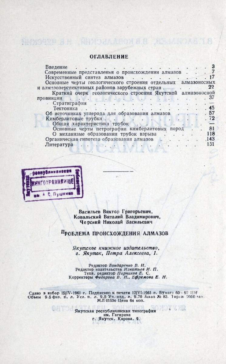 Проблема происхождения алмазов. - Якутск : Книжное издательство, 1961. - 152 с. с ил. и схем.