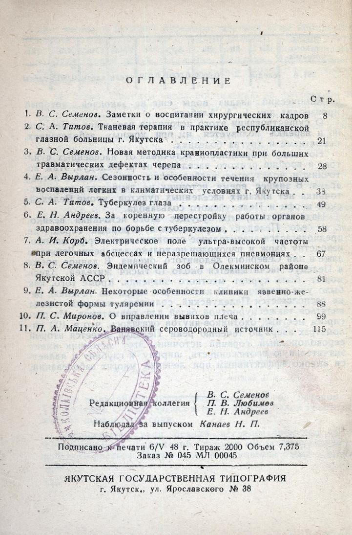 Сборник научных работ Якутской республиканской больницы / Народный комиссариат здравоохранения Якутской АССР. - Якутск : ГОСИЗДАТ ЯАССР, 1943- . - 22 см. Вып. 3. - 1948. - 116, [2] с.