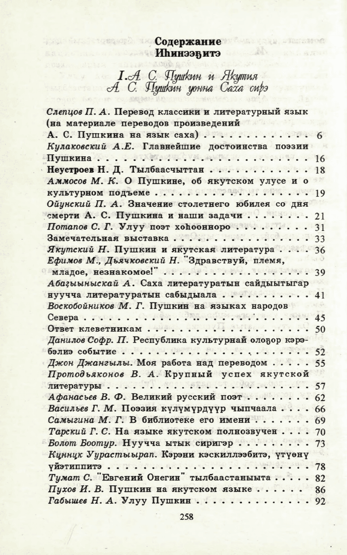 Бу кинигэҕэ киирбит ыстатыйалар, этиилэр, рецензиялар ааҕааччыны улуу поэт Саха сирин кытта сибээһин билиһиннэрэллэр. Кини айымньыларын сахалыы, эбээннии, эбэҥкилии, юкагирдыы тылбаастааһын боппуруоһун сырдаталлар. Манна Г.В. Ксенофонтов 1937 с. суруйбут "А.С. Пушкин "Алтан Аттааҕын" символларын туһунан" диэн үлэтэ аан бастаан бэчээккэ таҕыста. Кинигэ нуучча улуу поэта А.С. Пушкин төрөөбүтэ 200 сылыгар ананар