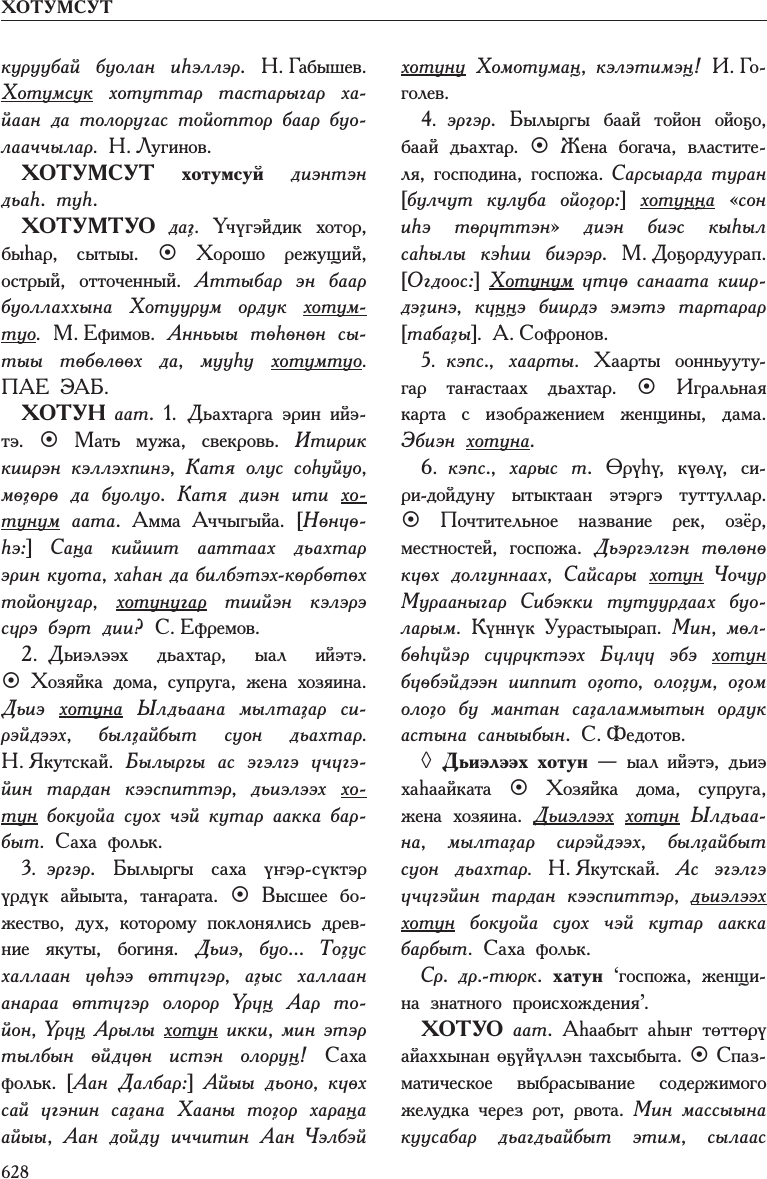 Большой толковый словарь якутского языка = Саха тылын быһаарыылаах улахан тылдьыта / Академия наук Республики Саха (Якутия), Институт гуманитарных исследований ; под общей редакцией П. А. Слепцова. - Новосибирск : Наука, 2004-. - 25 см. ISBN 5-02-032332-2. Впервые издаваемый многотомный академический "Толковый словарь якутского языка" с наибольшей полнотой охватывает лексику и фразеологию современного якутского литературного языка, распротраненные диалектизмы, народную лексику, изобразительные слова разговорного языка, а также специфический фольклорный фонд (устаревшие слова и выражения, формульные элементы и др.) Значения слов иллюстрируется речениями и цитатами из образцов якутской литературы и фольклора. Т. 13: (Буква Х) = (Х буукуба) : около 4000 слов и фразеологизмов / [к.филол.н. Е. В. Семенова, к.филол.н. Н. М. Васильева, И. В. Аммосова и др. ; ред.: к.филол.н. Н. Н. Васильева, к.филол.н. В. Д. Монастырев, к.филол.н. А. Г. Нелунов, к.филол.н. Н. И. Попова ; подгот.: Л. Н. Аммосова, Н. М. Васильева, М. Д. Куличкина и др.]. - 2016. - 636, [2] с. На обл. част. загл.