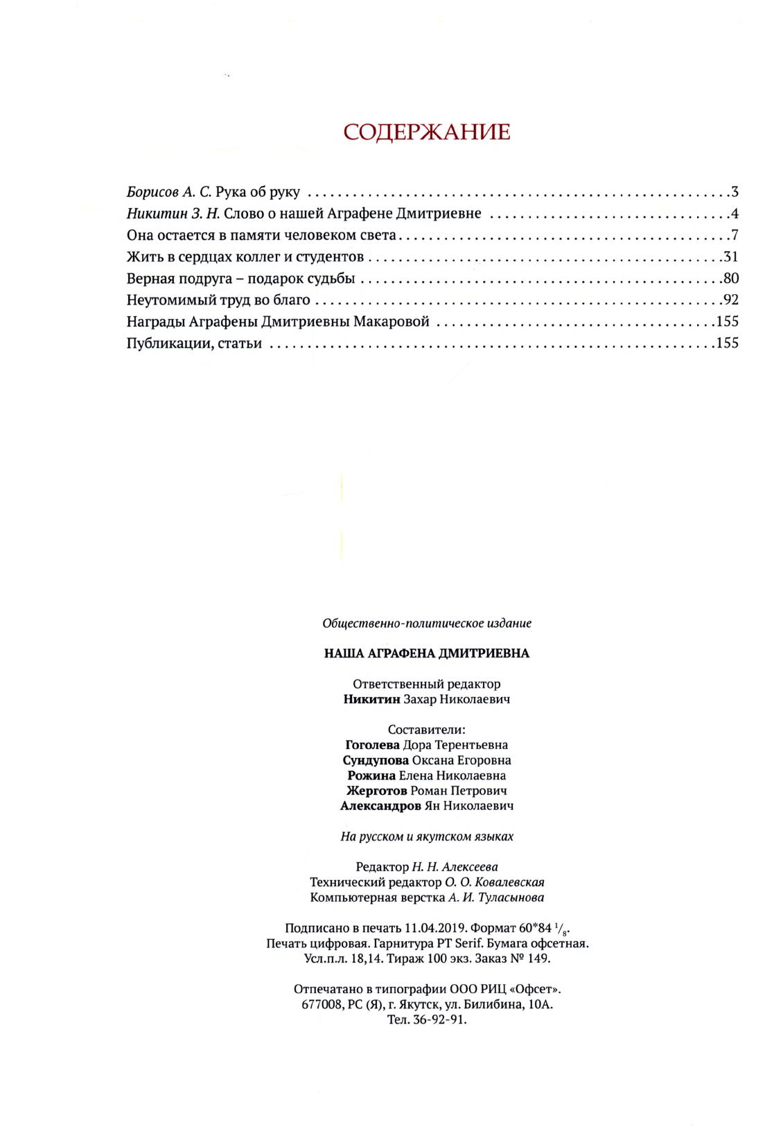 Наша Аграфена Дмитриевна : [воспоминания] / Министерство культуры и духовного развития Республики Саха (Якутия), ГПБОУ РС (Я) "Якутский колледж культуры и искусств" ; составители: Д. Т. Гоголева, О. Е. Сундупова, Е. Н. Рожина [и др.] ; ответственный редактор З. Н. Никитин ; [авторы предисловия: А. С. Борисов, З. Н. Никитин]. - Якутск : Офсет, 2019. - 155, [1] с.