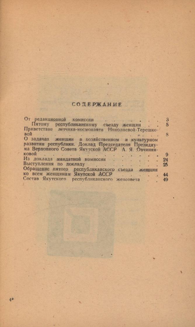 В строю едином : пятый съезд женщин Якутии / редакционная комиссия: К. С. Аржакова, А. В. Каплина, Т. Н. Маркова [и др.]. - Якутск : Якутское книжное издательство, 1970. - 49, [1] с.