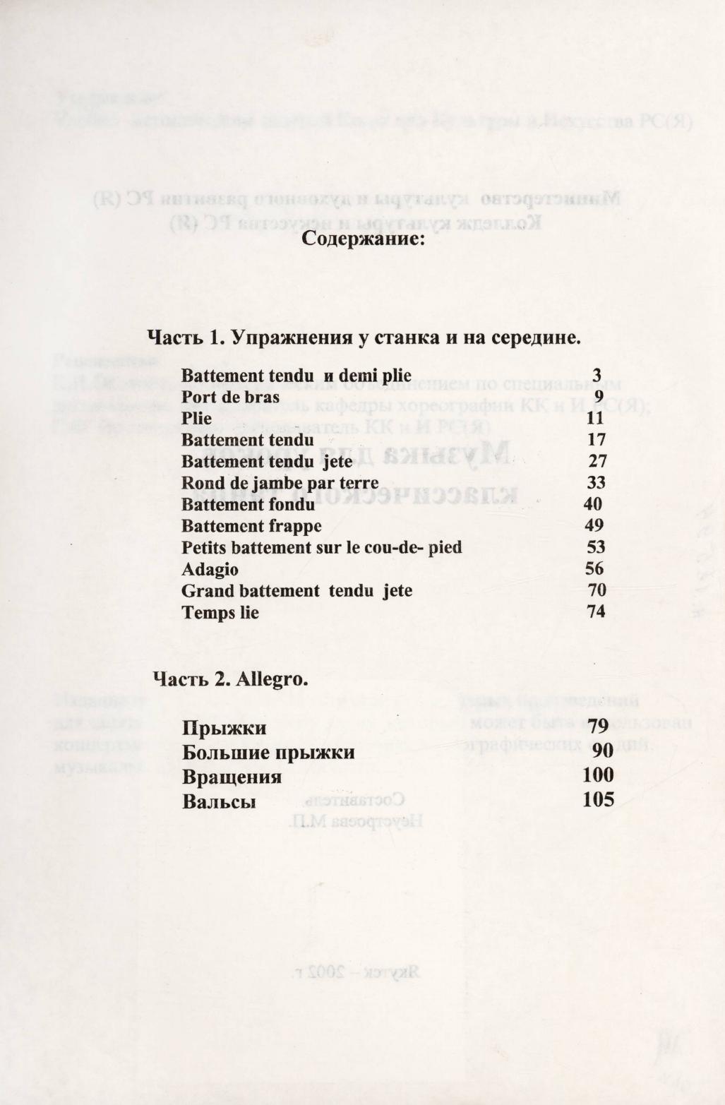 Музыка для уроков классического танца / Министерство культуры и духовного развития РС(Я), Колледж культуры и искусства РС(Я) ; составитель М. П. Неустроева . - Якутск : [б. и.], 2002. - 108, [4] с.