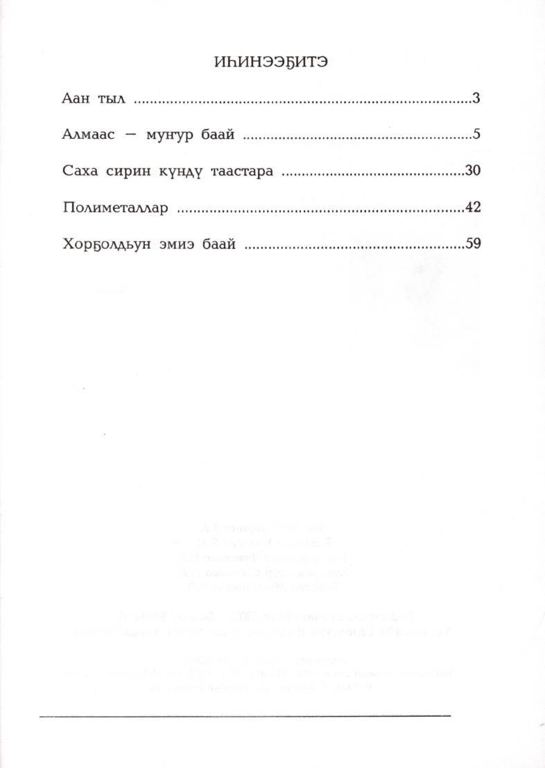 Алмаас, күндү таастар уонна атын туһалаах минераллар / К. М. Ермолаев ; научнай эрэдээктэр, киирии тылын суруйда Ю. Барашков ; [М. К. Аммосов аатынан Саха государственнай университета, Финансово-экономическай институт]. - Дьокуускай : РИО РНМЦ НТ И СКД им. А.Е. Кулаковского, 2002. - 82,[1] с.