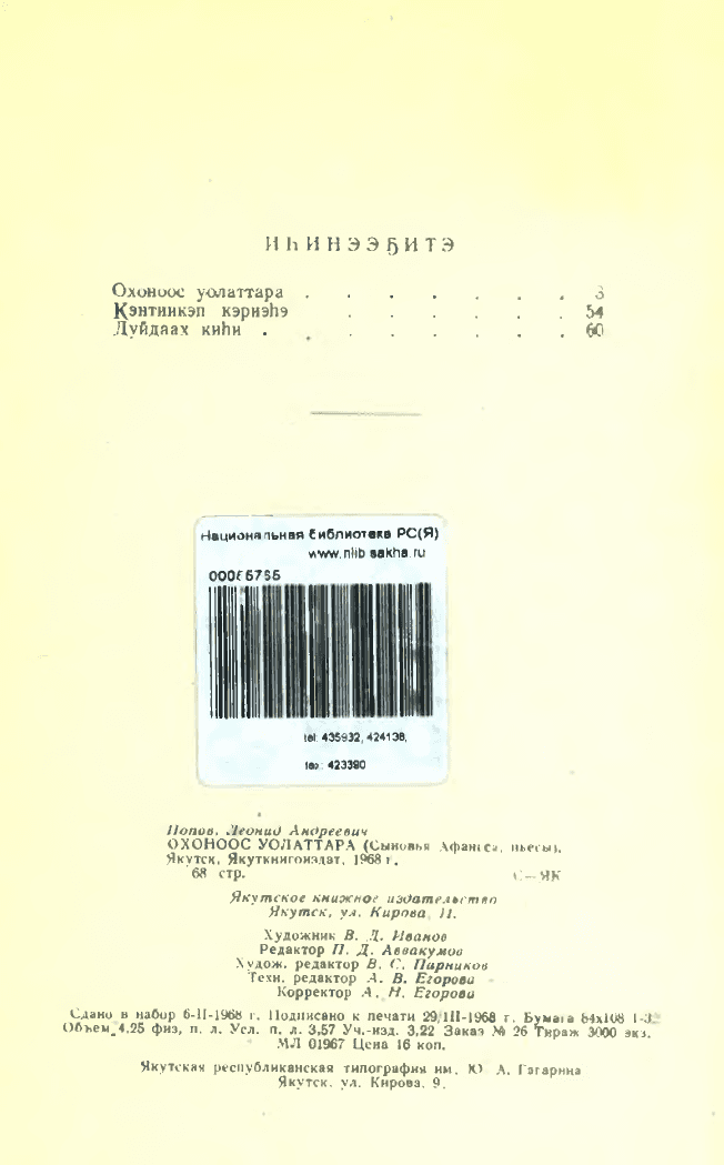 Саха сиринээҕи кинигэ издательствота, 1968. - 68 с.