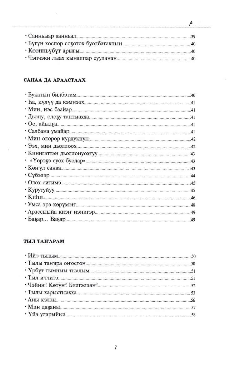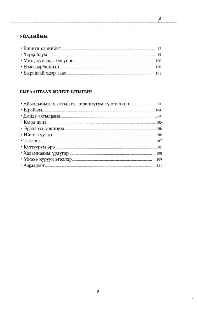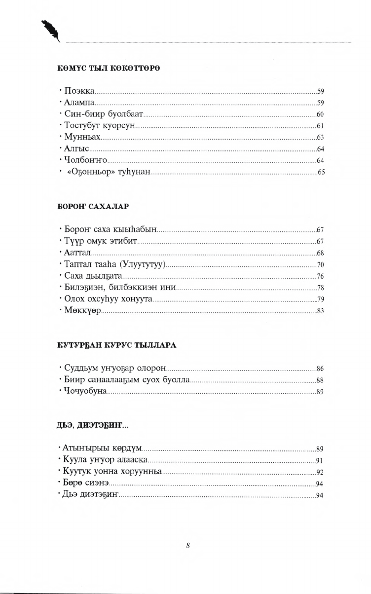 "Магические стихи". Здесь собраны ранее не напечатанные стихи Е.В. Слепцовой-Куорсуннаах. Сборник состоит из нескольких разделов. Автор своими стихами выражает эпические, лирические, патриотические чувства родного народа. Глубокие смысловые коллизии стихов обрамляются богатым материнским языком, тем самым сильнее притягивают читателя в магию слов.