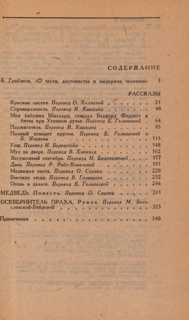 Рассказы ; Медведь ; Осквернитель праха : [сборник : перевод с английского] / Уильям Фолкнер ; составление и вступительная статья Б. Т. Грибанова ; примечания А. М. Зверева, Б. Т. Грибанова ; иллюстрации Н. Г. Раковской. - Москва : Правда, 1986. - 544 с. : ил. ).