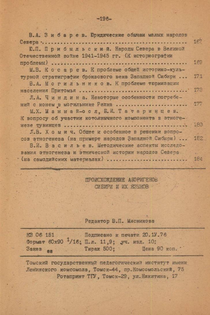 Происхождение аборигенов Сибири и их языков : материалы Всесоюзной конференции 3-5 июня 1976 года / [редколлегия: к.филол.н., доц. Э.Г. Беккер, д.филол.н. И. А. Воробьева, к.филол.н, доц. К. Ф. Гриценко и др.]. - Томск : [б. и.], 1976. - 196 с.