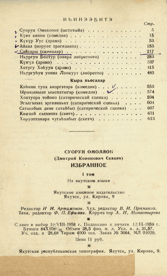 Суорун Омоллоон (1906-2005). Талыллыбыт айымньылар / Суорун Омоллоон (Д. К. Сивцев). - Якутскай : Саха сиринээҕи кинигэ изд- вота, 1959-1960. - Т. 1: Драматическай айымньылар. - 1959. - 614, [2] с.