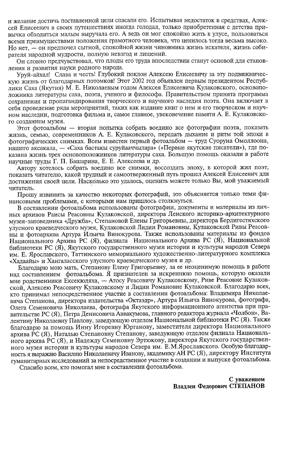 В фотоальбоме, выпущенном к 125-летию со дня рождения основоположника литературы саха А. Е. Кулаковского, показывается жизнь поэта, представлены его близкие и современники