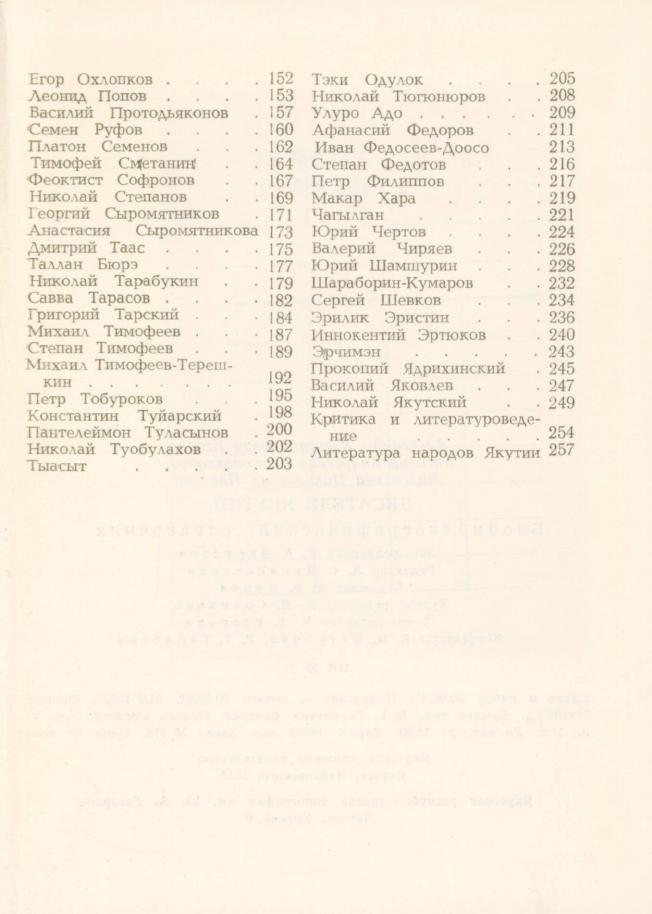 Писатели Якутии : биобиблиографический справочник / А. Егоров, В. Протодьяконов, В. Павлова ; отв. ред. Г. С. Сыромятников ; [послесл.: С. Данилов, Г. Сыромятников] ; Союз писателей Якутии, Лит. музей им. П. А. Ойунского, Якут. респ. б-ка им. А. С. Пушкина. - Якутск : Якутское книжное изд-во, 1981. - 268, [3] с.