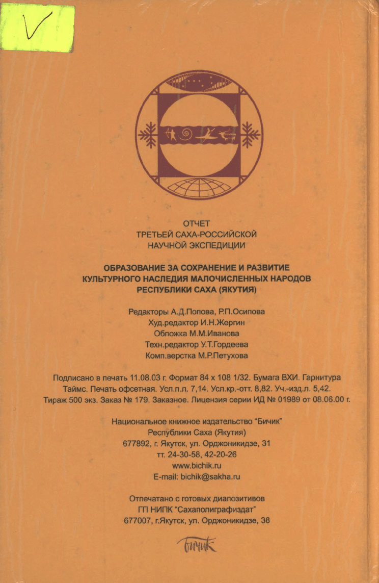 Образование за сохранение и развитие культурного наследия малочисленных народов Республики Саха (Якутия) : отчет третьей саха- российской научной экспедиции / . - Якутск : Бичик, 2003. - 126, [2] с.