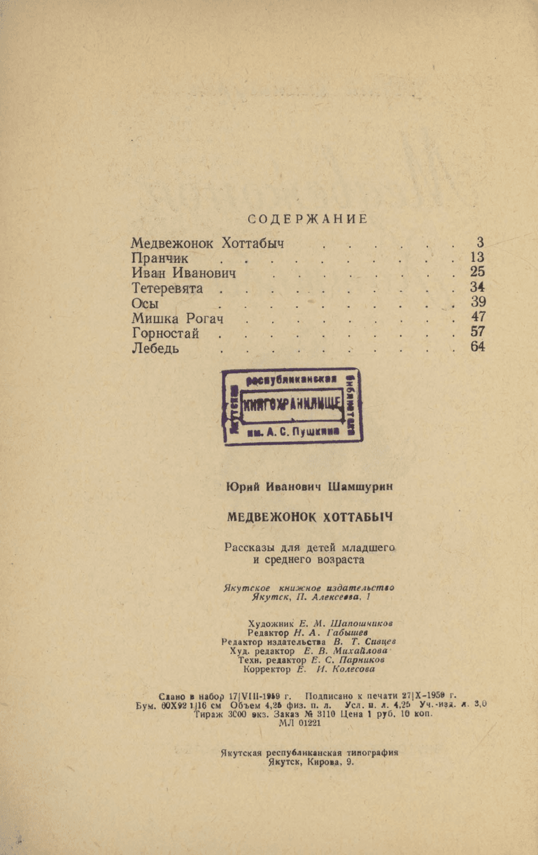 Медвежонок Хоттабыч : [рассказы для детей младшего и среднего школьного возраста] / Юрий Шамшурин ; [худ. Е. М. Шапошников]. - Якутск : Якутское кн. изд-во, 1959. - 67, [1] с.