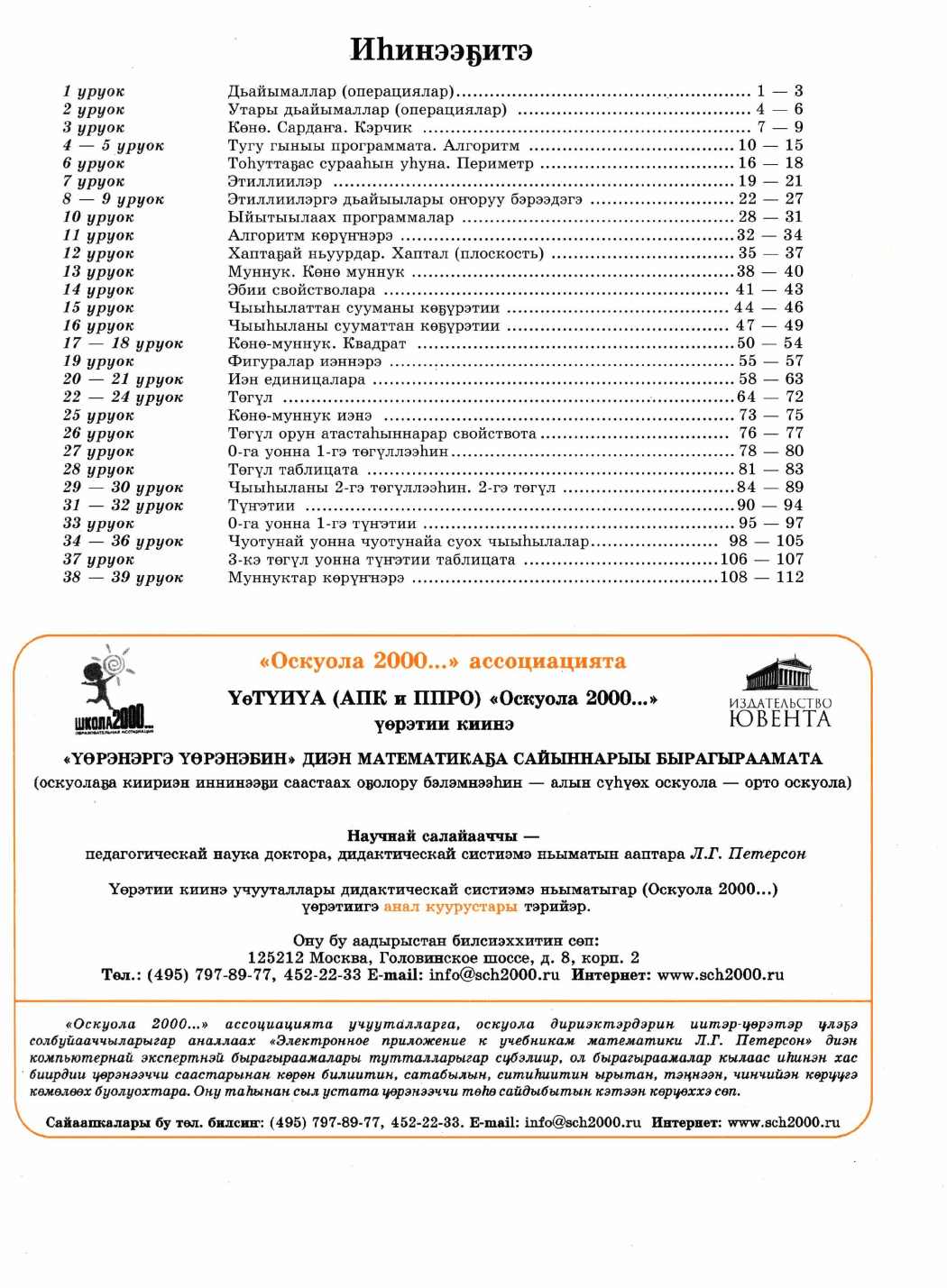 - 1. Петерсон Людмила Георгиевна. Математика. Үөрэнэргэ үөрэнэбин : 2 кылаас : уопсай үөрэхтээһин тэрилтэлэригэр аналлаах 3 чаастаах үөрэх кинигэтэ, 1 чааһа, 2012