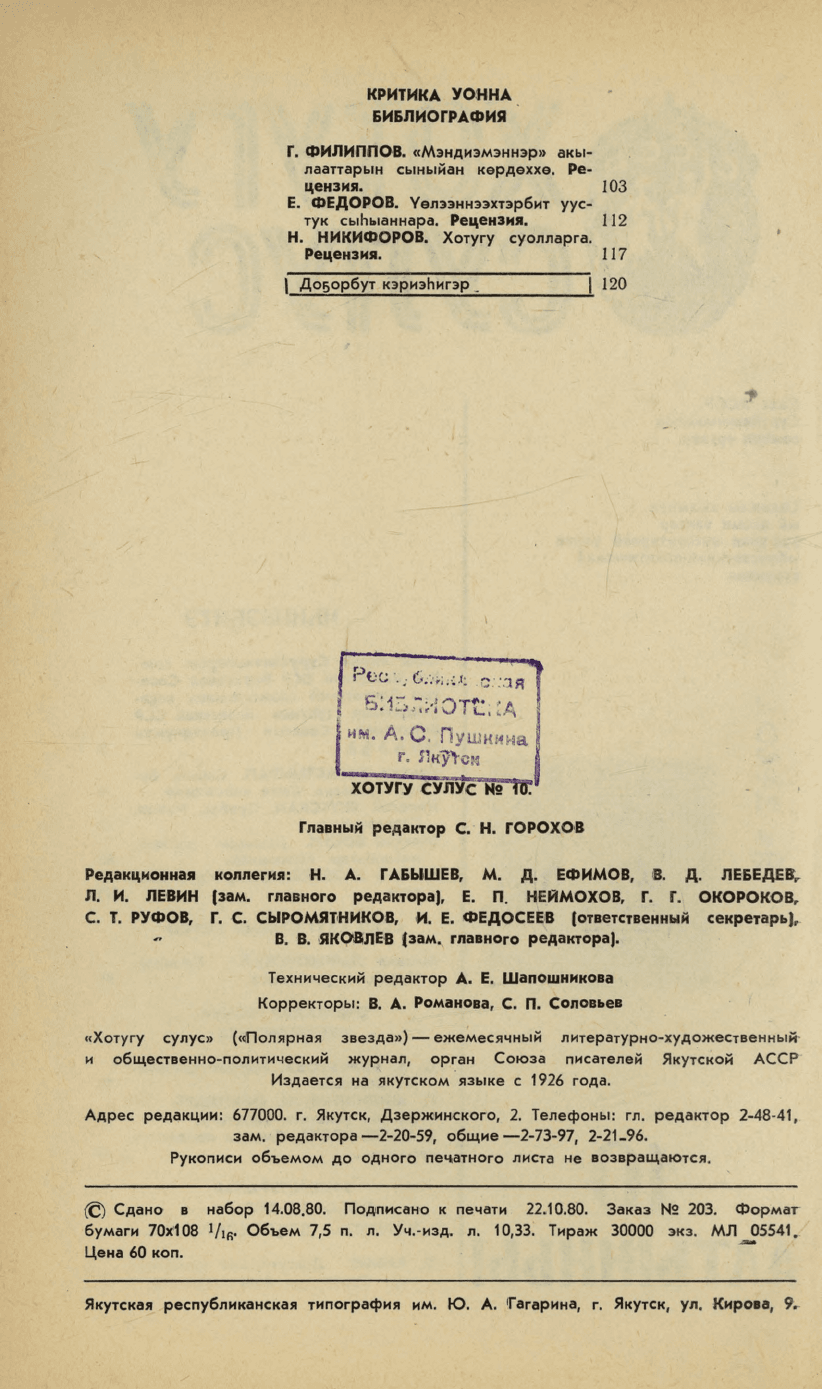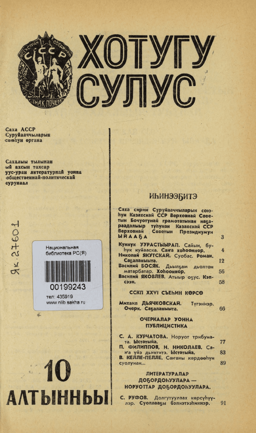 Хотугу сулус : [сахалыы тылынан уус-уран литературнай уонна общественно-политическай сурунаал] / САССР советскай суруйааччыларын союһа. - Якутскай : Саха сиринээҕи кинигэ издательствота, 1940-1989. 1980, N 10. - 1980. - 118, [2] с.