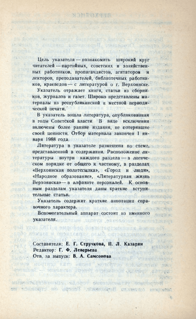 Верхоянск : библиографический указатель / Якут. респ. науч. б-ка им. А. С. Пушкина ; [сост.: Е. Г. Стручкова, П. Л. Казарян ; ред. Г. Ф. Леверьева ; отв. за вып. В. А. Самсонова]. - Якутск : [б. и.], 1988. - 47, [1] с.