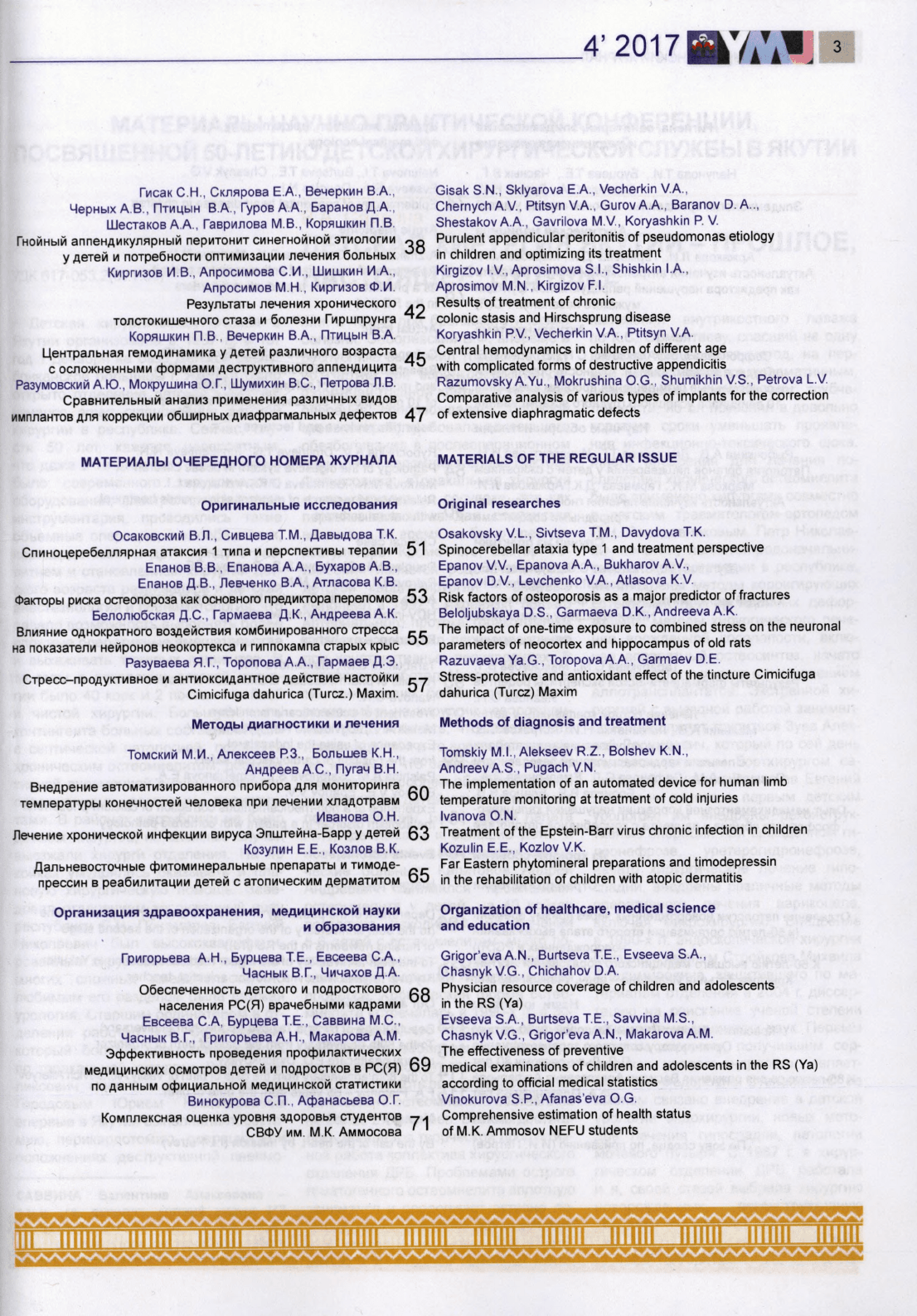 Якутский медицинский журнал / научно-практический журнал Якутского научного центра Российской Академии медицинских наук и Правительства Республики Саха (Якутия) ; главный редактор А. Н. Романова. – 2003 - . – Якутск : Сахаполиграфиздат, 2003 - . – Выходит 4 раза в год. – ISSN 1813-1905 (print). – ISSN 2312 (online). – 2017, N 4 (60)