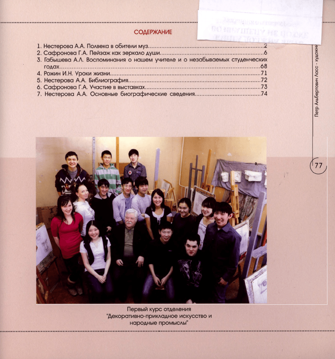 Художник-педагог Петр Альбертович Lass / Министерство культуры и духовного развития РС(Я), ГОУ "Якутское художественное училище им. П. П. Романова" ; [составитель, автор вступительной статьи А. А. Нестерова ; фотографии: А. Г. Степанов, М. Луговой]. - Якутск : Смик-мастер. Полиграфия, 2011. - 77 с. : ил., портр. ).