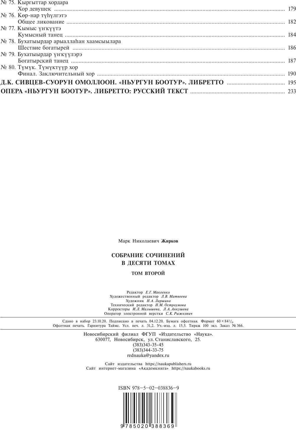 Собрание сочинений : в 10 томах / М. Н. Жирков ; [редколлегия: В. И. Тихонов, С. Н. Винокуров, В. Ф. Тихонова и др. ; научный руководитель, ответственный редактор Т. В. Павлова-Борисова, кандидат искусствоведения ; музыкальный редактор К. А. Герасимов] ; Министерство культуры и духовного развития Республики Саха (Якутия), Национальная библиотека Республики Саха (Якутия), Администрация муниципального района "Вилюйский улус (район)". - Якутск : Алаас, 2017-. - 29 см. Т. 2: Ньургун Боотур : опера в 4 действиях, 6 картинах : клавир / М. Н. Жирков, Г. И. Литинский ; либретто Суорун Омоллоона по мотивам якутского эпоса-олонхо ; русский текст М. Лаписовой ; в редакции: К. А. Герасимова, Т. В. Павловой-Борисовой ; составители: Т. В. Павлова-Борисова, В. Н. Павлова ; редакционная коллегия: Ю. С. Куприянов, С. Н. Винокуров, С. В. Максимова [и др.] ; музыкальная редакция К. А. Герасимов, Т. В. Павлова-Борисова ; редакция якутского текста либретто: В. Н. Павлова, Т. В. Павлова-Борисова ; редакция русского текста либретто Т. В. Павлова-Борисова ; ответственный за выпуск А. А. Дашевская ; автор вступительной статьи Т. В. Павлова-Борисова. - Новосибирск : Наука, 2020. - 266, [2] с.