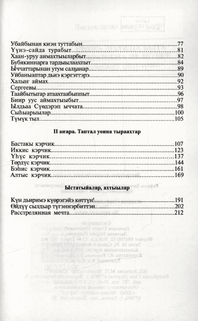 Айымньылар толору хомуурунньуктара : 10 томнаах / Рафаэль Баҕатаайыскай ; [хомуйан оҥордулар: философскай наука доктора, профессор, академик К. Д. Уткин, М. П. Лыткина, С. Р. Ермолаева]. - Дьокуускай : Сайдам, 2011-. - 20 см. Т. 18: Төрөппүттэрбит барахсаттар : (ахтыы-роман) / Рафаэль Баҕатаайыскай, Сахаайа Ермолаева ; [хомуйан оҥордулар: С. Н. Ермолаев-Сиэн Өкөр, М. П. Лыткина]. - 2016. - 222, [1] с.