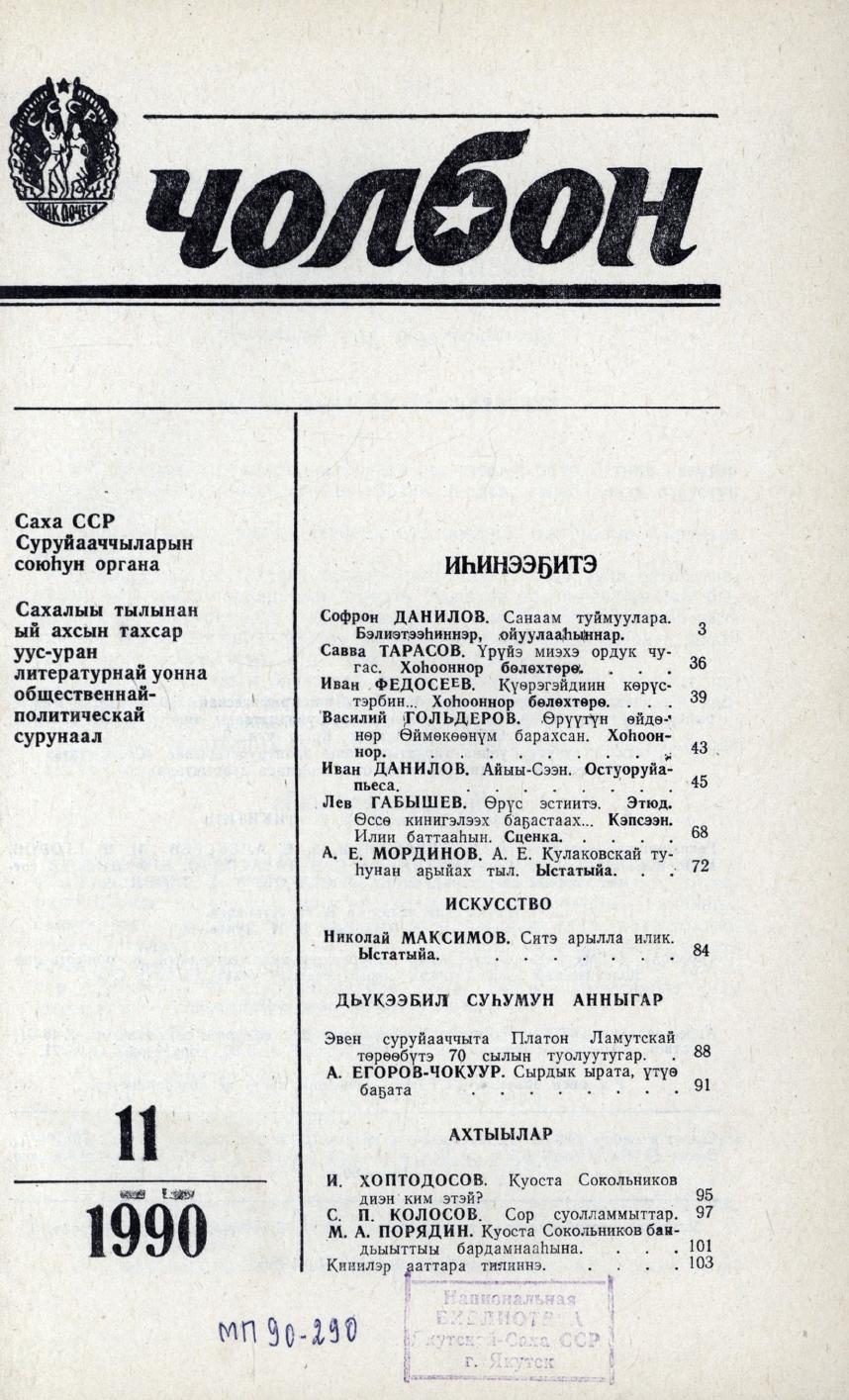- 1. Чолбон: уус-уран литературнай уонна общественнай-политическай сурунаал, 1990, №1