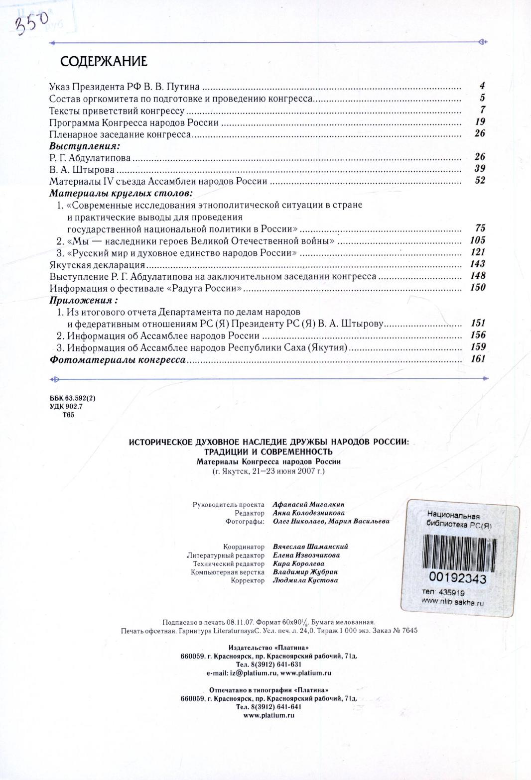 Историческое духовное наследие дружбы народов России: традиции и современность : материалы Конгресса народов России, г. Якутск, 21-23 июня 2007 г.) ; [редакторский совет: Абдулатипов Р. Г. (председатель) и др.]. - Якутск ; Красноярск : Платина, 2007. - 159, [33] с.