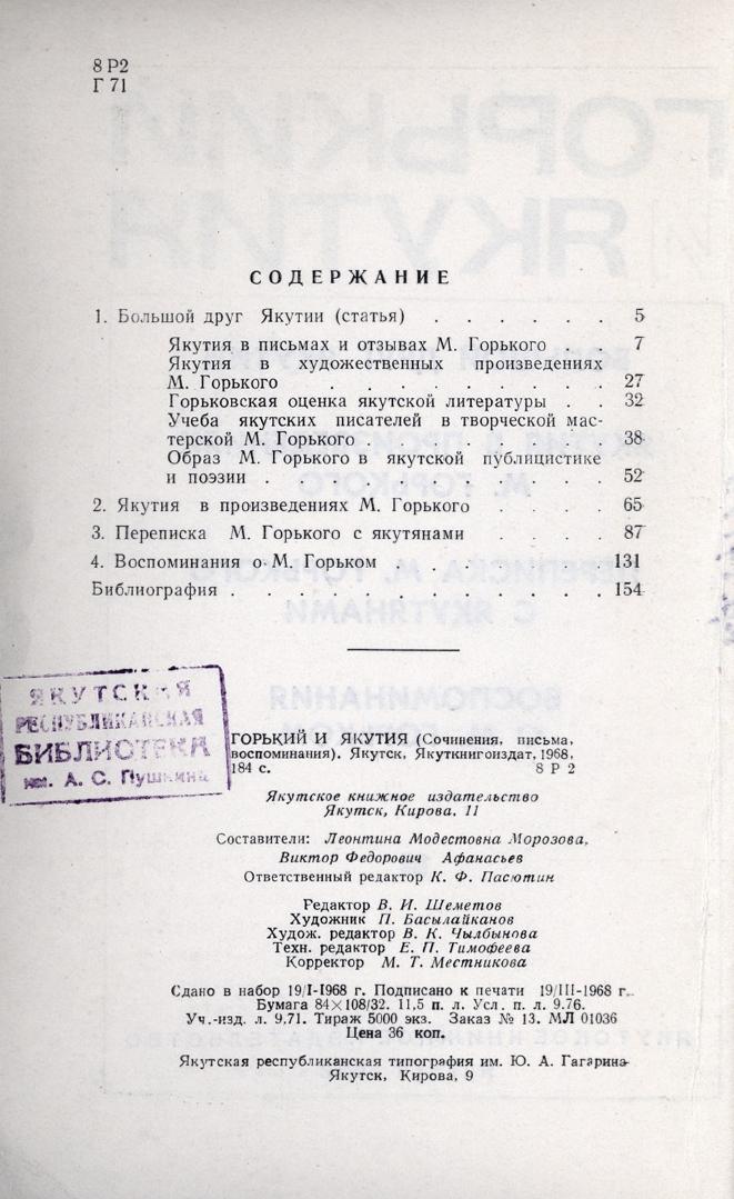 Горький и Якутия : сочинения, письма, воспоминания / составители: Л. М. Морозова, В. Ф. Афанасьев ; ответственный редактор К. Ф. Пасютин. - Якутск : Книжное издательство, 1968. - 183, [1] с.