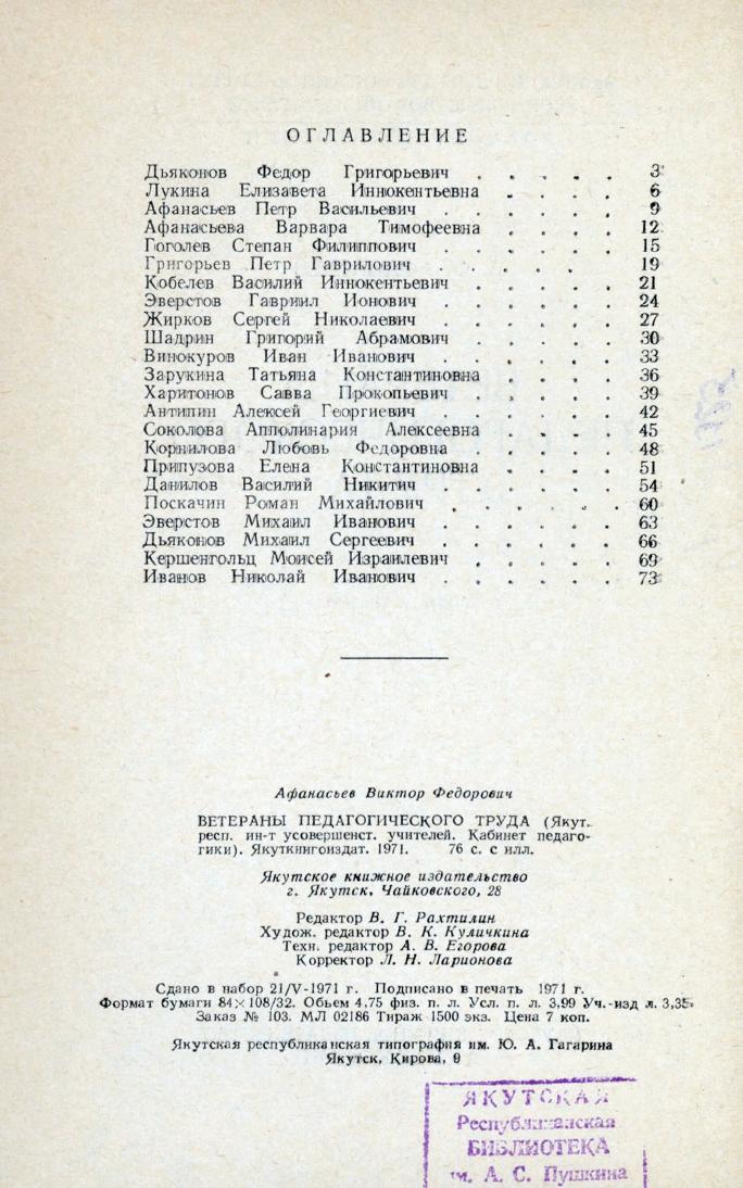 Ветераны педагогического труда / В. Ф. Афанасьев ; Якутский республиканский институт усовершенствования учителей, Кабинет педагогики. - Якутск : Якутское книжное издательство, 1965-1971. - 21 см. Вып. 3. - 1971. - 75, [1] с.