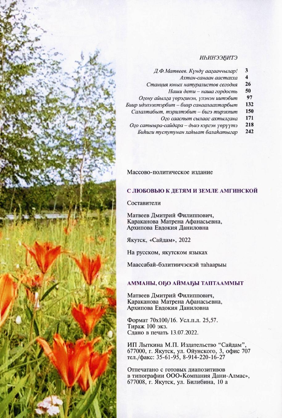 Аммабытын, оҕо аймаҕы таптааммыт = С любовью к детям и земле Амгинской : 30 сыла / "Амматааҕы эдэр натуралистар ыстаансыйалара" Муниципальнай оройуон эбии үөрэхтээһиҥҥэ тэрилтэтэ ; хомуйан онордулар: Д. Ф. Матвеев, М. А. Караканова, Е. Д. Архипова [уо.д.а.] ; эрэдээктэр А. А. Артемьева ; эрэдээксийэлиир сүбэ: Д. Ф. Матвеев, М. А. Караканова, А. А. Артемьева. - Дьокуускай : Сайдам, 2022. - 274, [6] с.