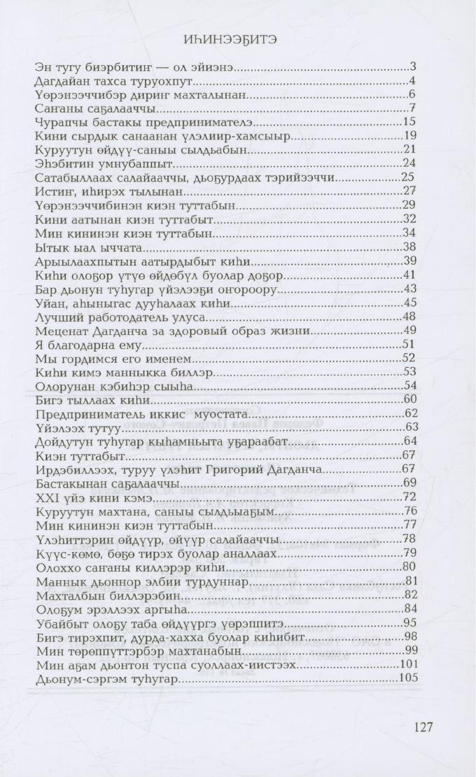 Сборник воспоминаний, статей, очерков родных, близких, друзей о частном предпринимателе Г. Г. Дагданча, почетного гражданина с. Чурапча, награжденного нагрудным знаком "Лидер перемен" за вклад в развитие малого предпринимательства в Республике Саха (Якутия)
